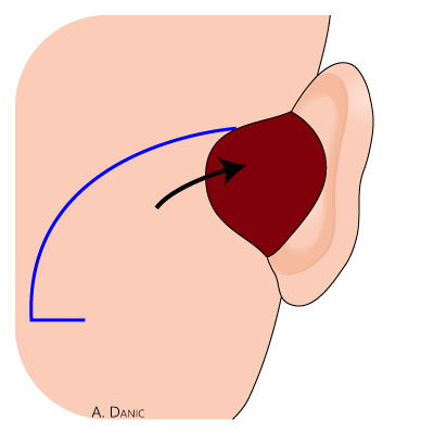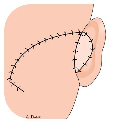 Si la perte de substance est supérieure à 3 cm dans l’axe transverse, il est possible de réaliser une greffe de peau totale sur la face postérieure du pavillon associée à un lambeau de glissement mastoïdien. Le greffon est prélevé dans la région pré- ou rétro-auriculaire controlatérale. Il est conseillé de fixer chacune des berges au plan profond en regard du sillon rétro-auriculaire, ceci en le suturant au périoste mastoïdien.